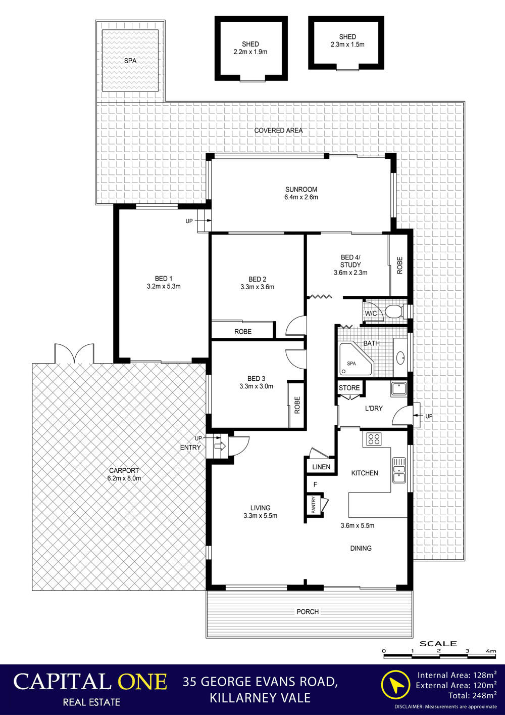 - An easy care level sun drenched 556m2 yard providing plenty of space for the family including multiple garden sheds for storage & spa to relax in
